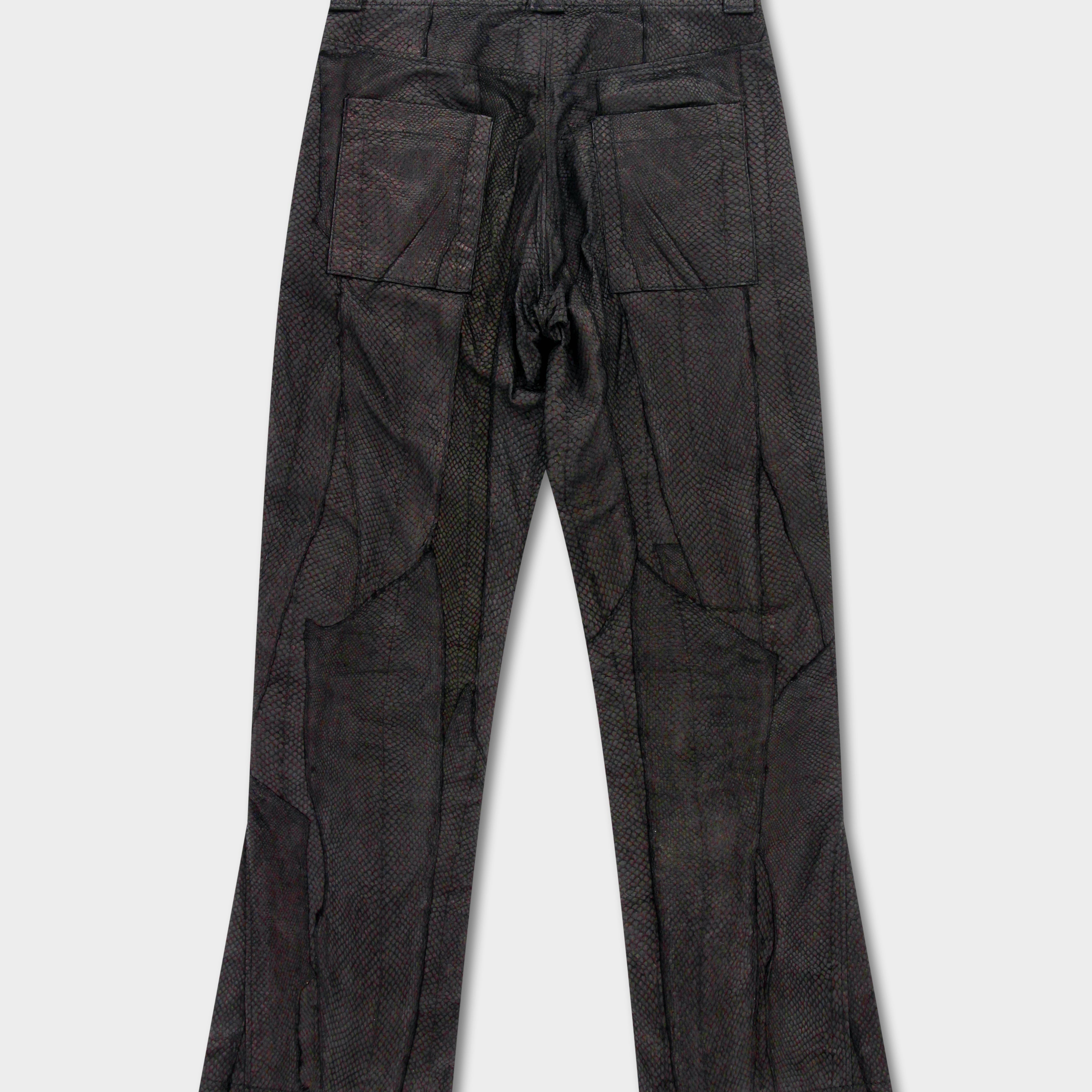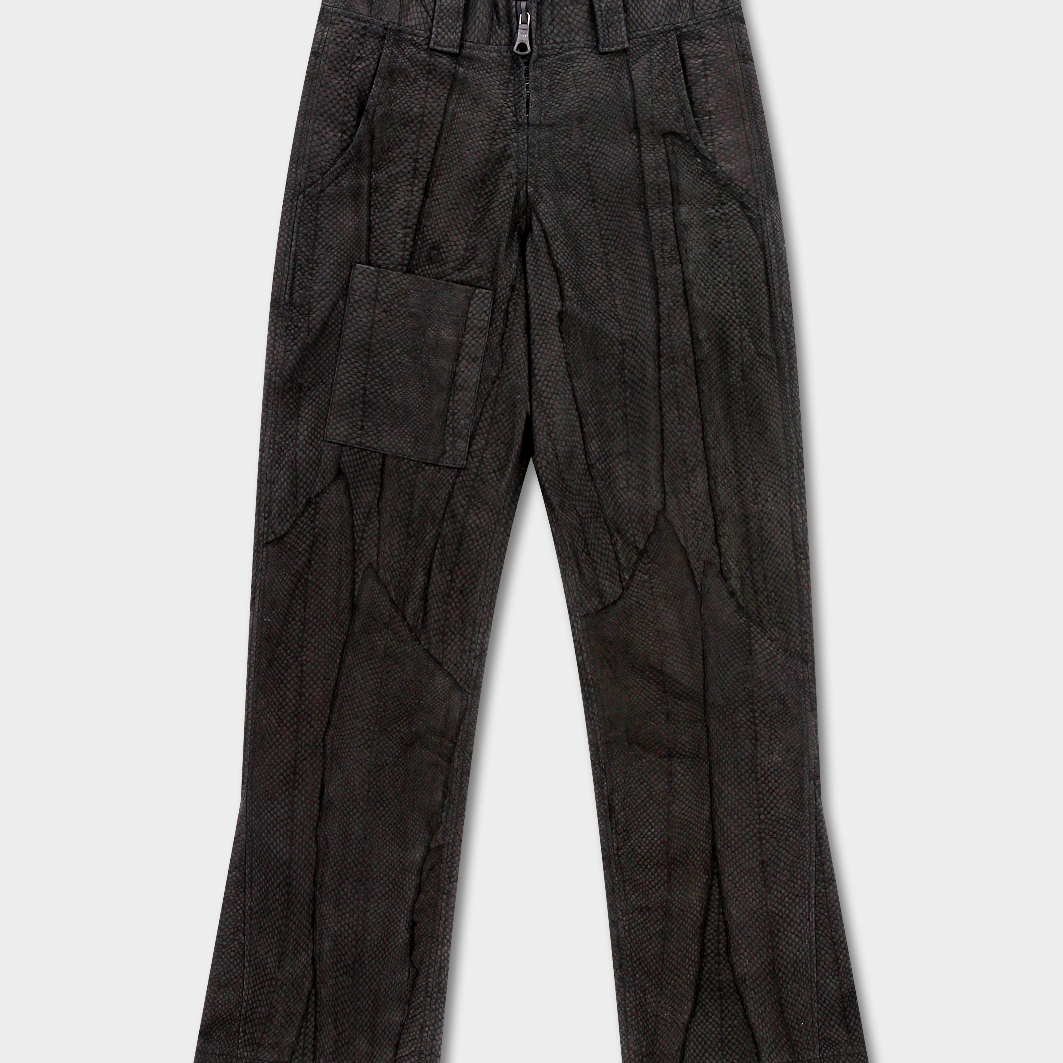 These trousers feature a standard fit, flare, four traditional pockets, one patch pocket, visible front zipper from "RIRI" and belt loops on the waistband.